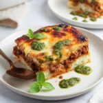 - Garnish and Serve: Allow the bake to cool for 10 minutes. Dollop basil pesto and scatter fresh basil leaves on top. Slice and serve warm for gooey, molten cheesy goodness.