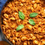 One-Pot Creamy Beef and Shells is a comforting and delicious weeknight meal featuring ground chuck sautéed with onions and garlic, simmered with medium shells pasta in a creamy tomato sauce, and finished with Pecorino Romano cheese and fresh basil for a rich, flavorful dish.