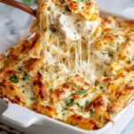 This creamy Chicken Alfredo Casserole combines tender penne pasta, juicy cubed chicken breast, and a rich Alfredo sauce made with cream cheese, whole milk, garlic, and Italian seasoning. Topped with melted mozzarella and Parmesan cheeses, it’s baked to bubbly perfection, making it a comforting and savory meal perfect for family dinners or gatherings.