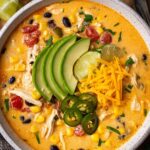 - Serve: Ladle the soup into bowls and garnish with chopped cilantro, sliced avocado, sour cream, tortilla strips or crushed chips, lime wedges, and jalapeños or chilies as desired. Serve hot.