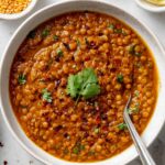 This Lentil Curry is a comforting, hearty, and protein-packed dish made with brown lentils simmered in a fragrant blend of garlic, ginger, warm spices, crushed tomatoes, and creamy coconut milk. It’s a rich, flavorful one-pot meal perfect for serving with basmati rice and vegan naan, ideal for a satisfying vegetarian dinner.