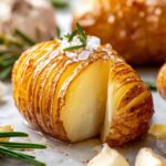 This Hasselback potatoes recipe features potatoes thinly sliced to create a fan effect, brushed with a flavorful garlic rosemary olive oil for a crispy outside and soft inside. Perfect as a side dish with a delicate balance of aromatic herbs and seasoning.