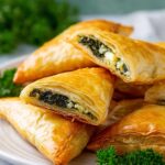 - Bake Spanakopita: Bake one sheet pan at a time in the preheated oven for 20 minutes or until the pastries are golden brown and crisp on top.
