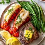 - Serve: Arrange the filet mignon steaks and lobster tails on individual plates. Top each steak with a pat of compound butter and garnish with lemon wedges. Serve immediately for best flavor.