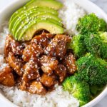 These Teriyaki Chicken and Rice Bowls feature bite-size pieces of boneless chicken breast simmered in a homemade teriyaki sauce, served with crisp-tender broccoli and creamy sliced avocado. This fresh and satisfying dish is perfect for an easy weeknight meal that combines sweet and savory flavors with nutrient-rich ingredients.