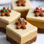 - Chill and Serve: Refrigerate the cheesecake bars for 2 hours to overnight to set completely. Remove from the pan using the parchment overhang, cut into 12 bars, and garnish with mini gingerbread cookies or festive sprinkles.