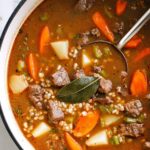Hearty and satisfying Beef Barley Soup made with tender stewing beef, fresh vegetables, and hulled barley simmered in a flavorful beef and tomato broth, perfect for a comforting meal.