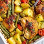 - Layer the Vegetables: In a baking dish, spread the deglazed pan juices evenly. Add the cubed potatoes, green beans, cherry tomatoes, sliced red onion, garlic, and green olives on top. Drizzle half of the prepared sauce over the vegetables and season the potatoes lightly with a pinch of salt if desired.
