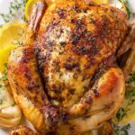 A flavorful Lemon Herb Roasted Chicken recipe featuring a juicy whole chicken infused with garlic, rosemary, thyme, and fresh lemon. Perfect for a family Sunday dinner, this dish yields tender, moist meat with golden crispy skin.