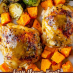 A delicious and easy Maple Dijon Chicken and Vegetables recipe featuring juicy chicken thighs baked with a sweet and tangy maple mustard sauce, accompanied by tender sweet potatoes and Brussels sprouts.