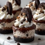 Delicious Mini No-Bake Oreo Cheesecakes made with a dairy-free base and creamy, whipped cheesecake filling. These easy-to-make treats feature a crunchy Oreo cookie crust topped with a smooth, dairy-free cream cheese and whipping cream blend, finished with a swirl of whipped cream and Oreo decoration. Perfect for vegan and dairy-free dessert lovers.