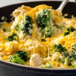 This One Pot Cheesy Chicken Broccoli and Rice Casserole is a comforting and hearty meal that's easy to prepare in just 30 minutes. Tender chicken breast is cooked with fragrant garlic and onions, then combined with creamy chicken soup, rice, and fresh broccoli florets. Finished with melted cheddar cheese and fresh parsley, this casserole is perfect for a wholesome weeknight dinner.