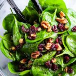 - Add toppings: Sprinkle the roughly chopped pecans and sweetened dried cranberries over the tossed spinach.