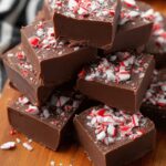 This creamy peppermint fudge combines rich semi-sweet chocolate with sweetened condensed milk and a hint of peppermint extract, topped with crushed candy canes for a festive and delicious holiday treat.