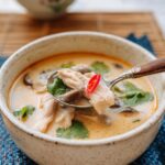 A flavorful and aromatic Thai coconut chicken soup called Tom Kha Gai, made with tender chicken thighs, mushrooms, fresh herbs, and a perfect balance of spicy, sour, sweet, and savory flavors, all ready in just 30 minutes.