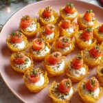 These Mini Smoked Salmon Hash Brown Cups are bite-sized delights perfect for brunch or party appetizers. Crispy baked tater tots form little golden cups filled with creamy whipped Boursin cheese, tangy Greek yogurt, and zesty lemon, topped with silky smoked salmon and a sprinkle of everything bagel seasoning. Garnished with fresh chives and pickled red onion or capers, these cups balance crispy, creamy, and savory flavors in every bite.