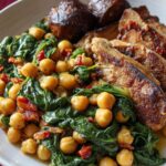 A vibrant and healthy dish featuring spicy chickpeas simmered with tomatoes and fresh spinach, perfect for a quick and flavorful main course or side dish.