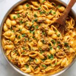 This Taco Pasta is a delicious one-pot meal combining the zesty flavors of taco seasoning with creamy cheese and tender pasta shells. Perfect for a quick and satisfying dinner, it features ground beef simmered in a rich sauce made with tomatoes, broths, and Velveeta cheese, then finished with a blend of shredded cheddar and Monterey Jack cheese for extra creaminess.