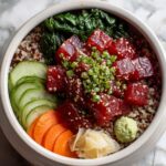 This vibrant Tuna Poke Bowl combines tender sashimi-grade tuna with perfectly seasoned sushi rice and a flavorful ginger marinade dressing. Topped with fresh vegetables like carrot, cucumber, radish, avocado, and edamame, this bowl offers a refreshing and wholesome meal that is as delightful to eat as it is easy to prepare.