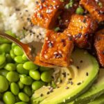 - Assemble the Bowls: Divide cooked rice into bowls, top with sticky tofu, steamed edamame, and sliced avocado. Drizzle with extra reserved sauce and sprinkle with optional sesame seeds and chopped spring onions for garnish. Serve immediately and enjoy!