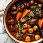 Beef Carbonnade is a rich and hearty Belgian-inspired stew made with tender beef short ribs slowly braised in a savory mixture of beer, beef stock, and aromatic herbs. This comforting dish combines caramelized onions, mushrooms, speck, and a touch of wholegrain mustard to create deep layers of flavor perfect for a satisfying meal.