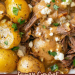 Shred the roast into large chunks and nestle it back in the pot to warm through for a minute. Serve the beef with halved potatoes generously slathered in blue cheese gravy and a finishing sprinkle of the remaining blue cheese. I promise your taste buds will be thanking you.